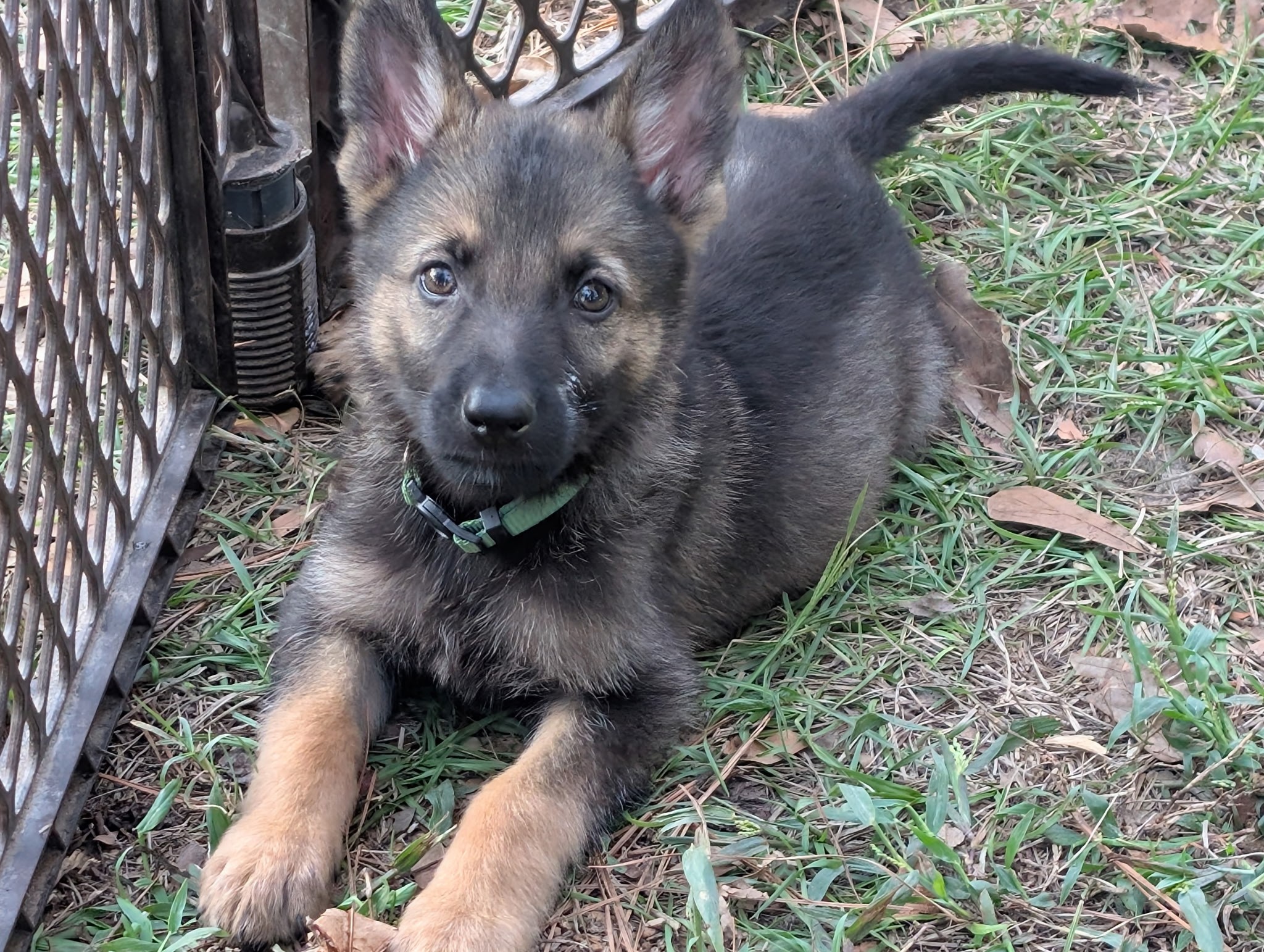 Lucky lives up to his powerful namesake as a remarkably alert and commanding sable German Shepherd puppy with a noble bearing that’s already evident in his confident stance and attentive expression.